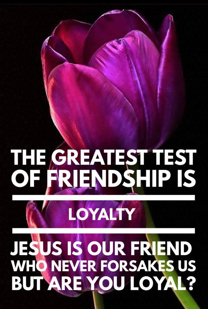 Loyalty is a fruit that grows from the vine of love. Jesus is the vine and He is love. Jesus is a forever Friend. We have His promise that guarantees He will never leave us or forsake us. Even so, friendship is a two-way street. Can you make the same promise to Jesus that you will always be His loyal friend?